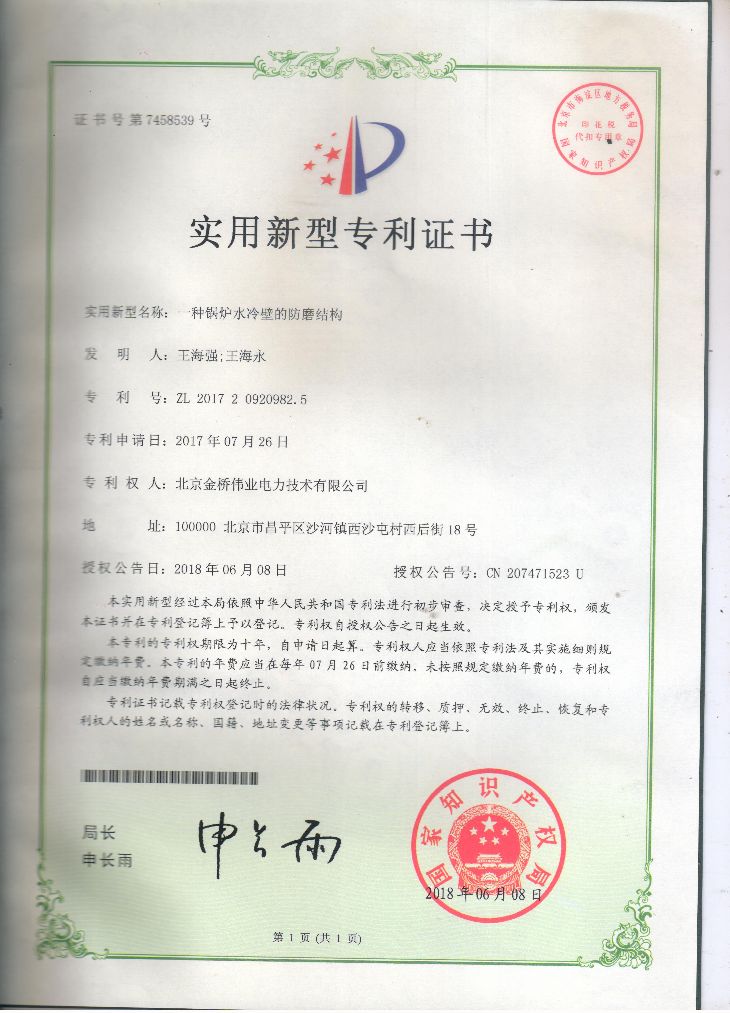 热烈庆祝我公司耐磨专利证书顺利下发